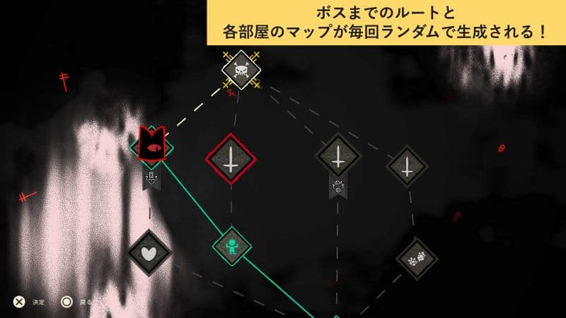 戦闘パートは、自動生成されたマップを探索しながらバフ(強化状態)を獲得し、ステージボスを倒していく流れ。